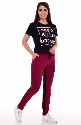 Оригинальный женский костюм из футера. Состоящий из футболки и брюк. Футболка немного укорочена. Горловина полукруглая, на полочке оригинальная печать. На рукавах отвороты. Брюки прямого покроя , вставка по внутренней части брюк, к низу немного заужены. Пояс с широкой резинкой. Удобные боковые карманы. Принт в виде печати на толстовке изумительно сочетается с нашивкой на брюках. Длина изделия по спинке: 42 р. - 48 см, 44 р. - 49 см, 46 р. - 50 см, 48 р - 52 см, 50 р. - 54 см, 52 р. - 56 см, 54 р - 58 см, 56 р - 60 см. Длина изделия по боковому шву: 42р. - 95 см, 44р. - 96 см, 46 р. - 97 см, 48 р - 98 см, 50 р. - 99 см, 52 р. - 100 см, 54 р - 101 см, 56 р - 102 см. Длина изделия по шаговому шву: 42 р. - 71 см, 44 р. - 71 см, 46 р. - 71 см , 48 р - 72 см, 50 р. - 72 см , 52 р. - 72 см, 54 р - 71 см, 56 р - 71 см.