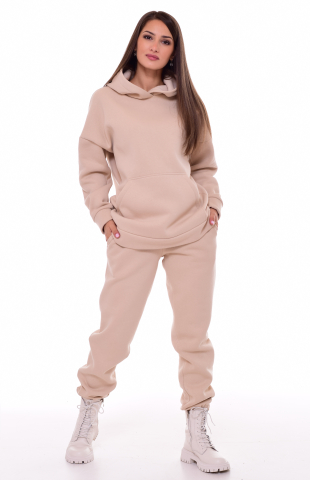 Костюм женский из теплого футера с начесом. Худи свободного кроя, удлиненная, с объемным капюшоном, карманом "кенгуру" на поясе, рукав со спущенной проймой длинный на манжете. Брюки-джоггеры свободного кроя с двумя боковыми карманами, пояс на широкой резинке со шнурком, низ брюк на широкой резинке. Длина толстовки по спинке: 42-71 см, 44-72 см, 46-73 см, 48-74 см, 50-75 см, 52-76 см, 54-77 см, 56-78 см, 58-78 см, 60-79 см. Длина брюк по боковому шву: 42-102 см, 44-103 см, 46-104 см, 48-105 см, 50-105 см, 52-105 см, 54-106 см, 56-106 см, 58-106 см, 60-106 см. Длина брюк по шаговому шву: 42-77 см, 44-77 см, 48-77 см, 50-77 см, 52-77 см, 54-77 см, 56-77 см, 58-77 см, 60-77 см.