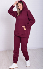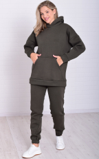 Костюм женский из теплого футера пенье с начесом. Худи свободного кроя, удлиненная, с объемным капюшоном, карманом "кенгуру" на поясе, рукав со спущенной проймой длинный на манжете. Брюки-джоггеры свободного кроя с двумя боковыми карманами, пояс на широкой резинке со шнурком, низ брюк на широкой резинке. Длина толстовки по спинке: 42-71 см, 44-72 см, 46-73 см, 48-74 см, 50-75 см, 52-76 см, 54-77 см, 56-78 см, 58-78 см, 60-79 см. Длина брюк по боковому шву: 42-102 см, 44-103 см, 46-104 см, 48-105 см, 50-105 см, 52-105 см, 54-106 см, 56-106 см, 58-106 см, 60-106 см. Длина брюк по шаговому шву: 42-77 см, 44-77 см, 48-77 см, 50-77 см, 52-77 см, 54-77 см, 56-77 см, 58-77 см, 60-77 см. Подкладки нет. Застежки нет. Плотность ткани: плотная. Карманы в боковых швах брюк и карман - кигуруми. Резинка и шнур в поясе брюк. Комплектность: толстовка и брюки. Высота посадки: средняя. Уход: деликатная стирка в машине при 30 градусах отдельно от других вещей.