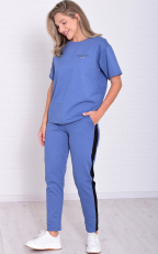 Костюм из футера двухнитки состоит из футболки и брюк. Футболка свободного кроя со спущенной проймой, на рукаве и полочке принт-слова. Брюки со средней посадкой, заужены к низу, с двумя боковыми карманами, на широком поясе с резинкой и шнуром. По боковому шву брюк лампасы черного цвета. Длина футболки: 42-60 см, 44-61 см, 46-62 см, 48-63 см, 50-64 см, 52-65 см, 54-66 см, 56-67 см,58-68 см, 58-68 см, 60-69 см. Длина по боковому шву брюк: 42-95 см, 44-96 см. 46-97 см, 48-98 см, 50-99 см, 52-100 см, 54-101 см, 56-102 см, 58-103 см, 60-104 см. Длина по боковому шву брюк: 42-95 см, 44-96 см, 46-97 см, 48-98 см, 50-99 см, 52-100 см, 54-101 см, 56-102 см, 58-103 см, 60-104 см. Длина по шаговому шву брюк: 42-75 см, 44-75 см, 46-73 см, 48-73 см, 50-73 см, 52-73 см, 54-73 см, 56-74 см, 58-74 см, 60-74 см. Подкладки нет. Застежки нет. Плотность ткани: средняя. Уход: машинная стирка 30 градусов отдельно от других вещей.