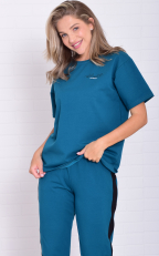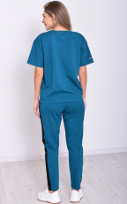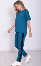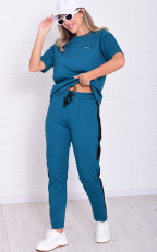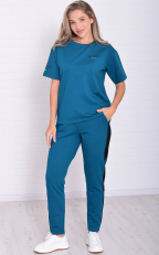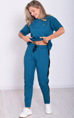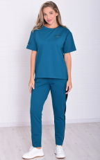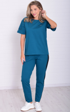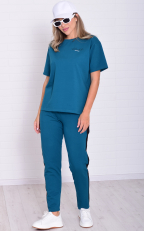 Состав: 72% -хлопок, 20%-пэ, 8%-эластан. Костюм из футера двухнитки состоит из футболки и брюк. Футболка свободного кроя со спущенной проймой, на рукаве и полочке принт-слова. Брюки со средней посадкой, заужены к низу, с двумя боковыми карманами, на широком поясе с резинкой и шнуром. По боковому шву брюк лампасы черного цвета. Длина футболки: 42-60 см, 44-61 см, 46-62 см, 48-63 см, 50-64 см, 52-65 см, 54-66 см, 56-67 см,58-68 см, 58-68 см, 60-69 см. Длина по боковому шву брюк: 42-95 см, 44-96 см. 46-97 см, 48-98 см, 50-99 см, 52-100 см, 54-101 см, 56-102 см, 58-103 см, 60-104 см. Длина по боковому шву брюк: 42-95 см, 44-96 см, 46-97 см, 48-98 см, 50-99 см, 52-100 см, 54-101 см, 56-102 см, 58-103 см, 60-104 см. Длина по шаговому шву брюк: 42-75 см, 44-75 см, 46-73 см, 48-73 см, 50-73 см, 52-73 см, 54-73 см, 56-74 см, 58-74 см, 60-74 см. Подкладки нет. Застежки нет. Плотность ткани: средняя. Уход: машинная стирка 30 градусов отдельно от других вещей.
