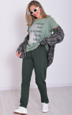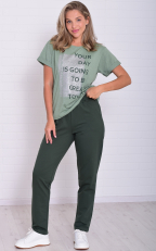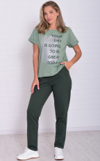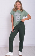 Женский костюм из плотных брюк и облегченной тонкой футболки. Футболка свободного кроя, с круглой горловиной, короткий рукав на манжете, принт на полочке удачно гармонирует с брюками. Брюки прямые, посадка высокая, на широком поясе с резинкой, в боковых швах карманы. Костюм отлично подходит для летних прогулок, домашнего времяпровождения и активного отдыха. Длина футболки по спинке: 48-63 50-64 52-65 54-66 56-67 58-68 60-69 62-70 64-71 Длина брюк по боковому шву: 48-102 50-103 52-104 54-104 56-105 58-106 60-107 62-108 64-109 Длина по боковому шву (48-64) - 76 см Брюки:72% -хлопок, 20%-пэ, 8%-эластан. Футболка: 50%-хлопок, 50%-пэ.