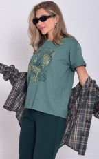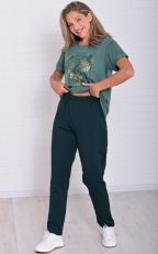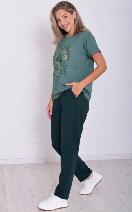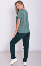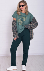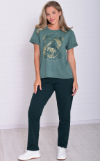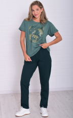 Женский костюм из легкой футболки с принтом и более плотных по фактуре брюк. Футболка прямого кроя со спущенной проймой, низ рукава подвернут манжетом. Брюки слегка заужены к низу, с высокой посадкой на широкой резинке, в боковых швах карманы. Костюм максимально универсален и применим по любому поводу: на прогулке, дома, в поезде, самолете, и даже на деловой встрече, остается только добавить классический пиджак и серьезный подход к делу.