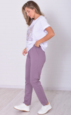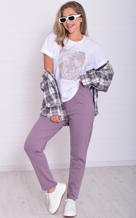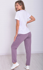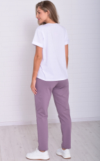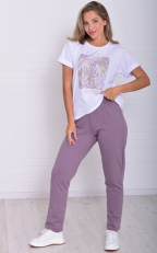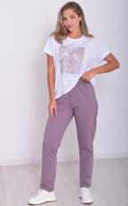 Женский костюм из легкой футболки с принтом и более плотных по фактуре брюк. Футболка прямого кроя со спущенной проймой, низ рукава подвернут манжетом. Брюки слегка заужены к низу, с высокой посадкой на широкой резинке, в боковых швах карманы. Костюм максимально универсален и применим по любому поводу: на прогулке, дома, в поезде, самолете, и даже на деловой встрече, остается только добавить классический пиджак и серьезный подход к делу.