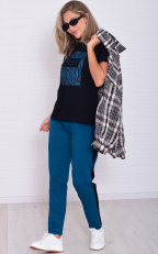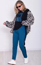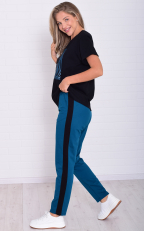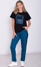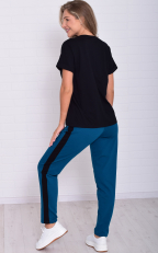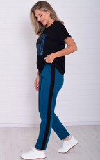 Брюки: 72%-хлопок, 20%-пэ, 8%-эластан. Футболка: 100% -хлопок Летний женский костюм с брюками и футболкой. Футболка из легкого трикотажа свободного кроя с коротким рукавом на манжете. Брюки из хлопкового футера 2х нитки с высокой удобной посадкой на широкой резинке в боковых швах карманы с отрезным боком. Ткань плотная, держит форму, не скатывается, колени не вытягиваются. На брюках контрастный лампас в цвет футболки. Костюм универсальный, комфортный для прогулки, спорта, путешествий, домашних дел. Длина брюк по боковому шву: 44-99см,46-100см,48-100см,50-101см,52-102см,54-103см,56-104см,58-105см,60-105см.Длина брюк по шаговому шву:44-72см,46-72см,48-72 см,50-72 см,52-72 см,54-72 см,56-72 см, 58-72 см,60-72 см. Ширина брюк в бедрах:44-52см,46-54см,48-56 см,50-58см,52-60см,54-62см,56-64см,58-66см,60-68см. Ширина брюк в талии:44-40см,46-41см,48-42см,50-43см,52-44см,54-46 см,56-47см,58-48см,60-49см.Длина футболки по спинке:44-61см,46-62см,48-63см,50-64см,52-65см,54-66см,56-67см,58-68см,60-69см,62-70см,64-71см.