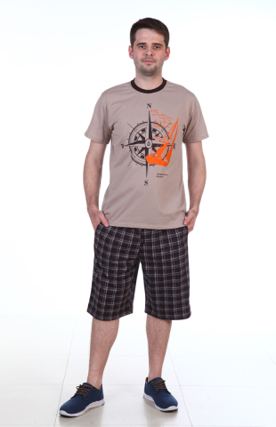 Состав: Футболка: 100% - хлопок, шорты: 50%- хлопок, 50% -пэ. Оригинальный женский костюм из кулирки, состоящий из футболки и шорт. Футболка - горловина полукруглая, окантованная. Рукав притачной с манжетом. Шорты - верх широкая резинка со шнуром обработана на спецмашине, низ подгибка. Принт в виде печати на полочке и на шортах. Длина изделия по спинке: 42 р. - 64 см, 44 р. - 64 см, 46 р. - 65 см, 48 р. - 66 см, 50 р. - 67 см, 52 р. - 67 см, 54 р - 68 см, 56 р. - 69 см, 58 р. - 70 см, 60 р - 71 см. Длина изделия по боковому шву: 42р. - 46 см, 44р. - 46 см, 46р. - 47 см, 48р. - 48 см, 50р. - 49 см, 52 р. - 50 см, 54 р - 50 см, 56 р. - 51 см, 58 р. - 52 см, 60 р - 53 см. Длина изделия по шаговому шву: 42 р. - 18см, 44 р. - 18см, 46 р. - 18см, 48 р. - 18см, 50 р. - 18 см, 52 р. - 18см, 54 р - 18 см, 56 р. - 18 см, 58 р. - 18 см, 60 р - 18 см.