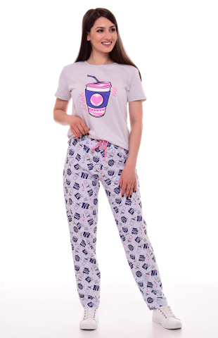 Пижама женская из кулирки с рисунком, с новогодним принтом символ - 2021 год в виде печати . Состоящий из футболки с длинным рукавом и брюк. Футболка - горловина полукруглая. Брюки прямого покроя с широким поясом и шнуром. Низ - подгибка. Длина изделия по спинке: 42 р - 60 см, 44 р. - 61 см, 46 р. - 62 см, 48 р - 63 см, 50 р. - 65 см, 52 р. - 66 см, 54 р. - 67 см, 56 р. - 68 см. Длина изделия по боковому шву: 42 р - 96 см, 44р. - 96 см, 46 р. - 97 см, 48 р - 97 см, 50 р. - 98 см, 52 р. - 99 см, 54 р. - 99 см, 56 р. - 100 см. Длина изделия по шаговому шву: 42 р - 72 см, 44 р. - 72 см, 46 р. - 72 см, 48 р - 72 см, 50 р. - 72 см, 52 р. - 72 см, 54 р. - 72 см, 56 р. - 72 см.