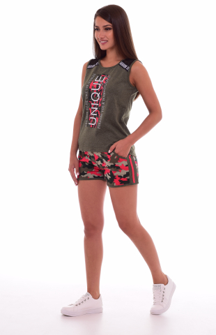 Пижама женская из кулирки. Состоит из футболки и брюк. Футболка с полукруглой окантованой горловиной и спущеным окантованым рукавом. Вствки в виде пагонов великолепно сочетаются со спинкой изделия.Изящный принт в виде печати великолепно гарманирует с окантовкой брюк. Брюки с широким поясом на резинке, люверсы, шнурок. Удобные окантованные карманы. Низ брюк на манжете. Сделан принт в виде разреза для оголения коленок. Разрез коленок окантован. Длина изделия 50 размера: длина футболки по спинке - 67см длина брюк по боковому шву - 100 см длина по шаговому шву - 75см.