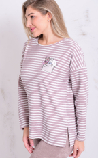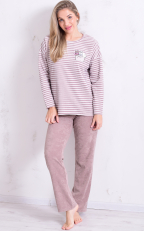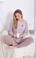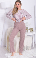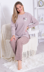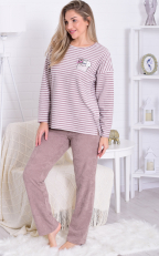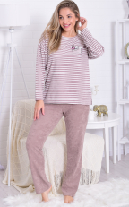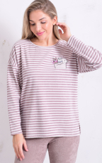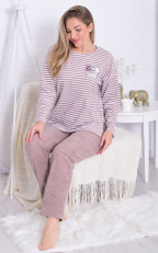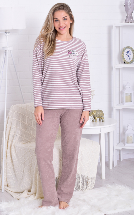 Пижама женская из мягкой махры премиум качества. Однотонный джемпер свободного кроя со спущенной проймой и длинными рукавами, горловина круглая, по бокам разрезы на полочке, принт с забавными медведями. Брюки прямые в полоску, не широкие, с двумя боковыми карманами на широком поясе с резинкой. Длина джемпера по спинке: 42-64 см, 44-65 см, 46-66 см, 48-67 см, 50-68 см, 52-70 см, 52-70 см, 54-72 см, 56-73 см, 58-74 см, 60-75 см. Длина брюк по боковому шву: 42-102 см, 44-103 см, 46-104 см, 48-104 см, 50-104, 52-105 см, 54-105 см, 56-106 см, 58-107 см, 60-107 см. Длина брюк по шаговому шву: 42-77 см, 44-77 см, 46-77 см, 48-77 см, 50-77 см, 52-77 см, 54-77 см, 56-77 см, 58-76 см, 60-76 см. Подкладки нет. Застежки нет. Плотность ткани: средняя. Карманы в боковом шве брюк. Комплектация: джемпер и брюки. Резинка в поясе брюк. Декор: принт на полочке. Высота посадки: средняя. Уход: деликатная стирка в машине при 30 градусах отдельно от других вещей.