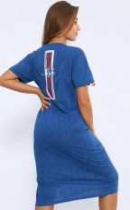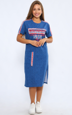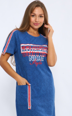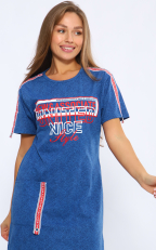 Стильная женская туника из кулирки. Приталеного покроя. С карманом.На кармане принт в виде отделочной ленты.Также отделочная лента присутствует на плечевых швах в виде пагонов. На ленте принт-люверсы.Присутствует разрез с одого бока. Длина изделия 50 размера: длина по спинке - 106 см. Состав: 100%-хлопок.