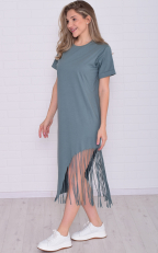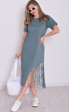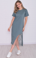 Состав: 100% хлопок Женское хлопковое платье-футболка свободного кроя в длине миди. Горловина круглая по низу, рукава манжеты. По низу платья ассиметрично с одной стороны бахрома-тренд сезона. Длина:42-117,44-118,46-119,48-120,50-121,52-122,54-123,56-124,58-124,60-125. Обхват груди: 42-46,44-48,46-50,48-52,50-54,52-56,54-58,56-60,58-62,60-64. Обхват бедер: 42-50,44-52,46-54,48-56,50-58,52-60,54-62,56-64,58-66,60-68. Длина рукава с плечом: 42-31,44-31,46-32,48-32,50-33,52-34,54-35,56-36,58-37,60-38.