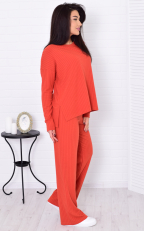 Женский костюм свободного кроя из трикотажа "лапша". Свитшот с круглой горловиной и спущенной проймой, длинные рукава и разрезы по бокам. Брюки палаццо с высокой посадкой на резинке. Длина свитшота по спинке: 42-67 см, 44-68 см, 46-69 см, 48-70 см, 50-71 см, 52-72 см, 54-73 см, 56-74 см. Длина брюк по боковому шву: 42-108 см, 44-108 см, 46-109 см, 48-109 см, 50-110 см, 52-110 см, 54-111 см, 56-111 см. Длина брюк по шаговому шву: 42-78 см, 44-78 см, 46-78 см, 48-78 см, 50-78 см, 52-78 см, 54-78 см, 56-78 см.
