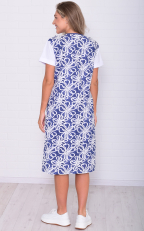 Платье женское, имитирующее сарафан с футболкой. На бретели нашита отделочная тесьма с пуговицей, на полочке нагрудный карман с клапаном и два кармана в боковом шве. Длина сарафана по спинке: 48-110 см, 50-112 см, 52-115 см, 54-116 см, 56-116 см, 58-117 см, 60-118 см, 62-118 см.