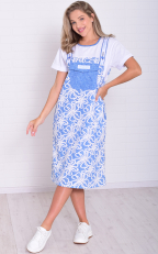 Состав: 100%-хлопок. Платье женское, имитирующее сарафан с футболкой. На бретели нашита отделочная тесьма с пуговицей, на полочке нагрудный карман с клапаном и два кармана в боковом шве. Длина сарафана по спинке: 48-110 см, 50-112 см, 52-115 см, 54-116 см, 56-116 см, 58-117 см, 60-118 см, 62-118 см.
