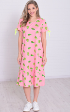 Состав: 100%-хлопок. Оригинальное женское платье из кулирки. Горловина полукруглая , окантованная. Платье к низу слегка расклешенное. Рукав немного короткий с разрезом и вставлен яркий шнур. По низу идет валан со сборкой. Длина изделия по спинке: 48 р - 113 см, 50 р. - 113 см, 52 р. - 114 см, 54 р. - 114 см, 56 р. - 115 см, 58 р. - 115 см, 60 р. - 116 см, 62 р. - 116 см.