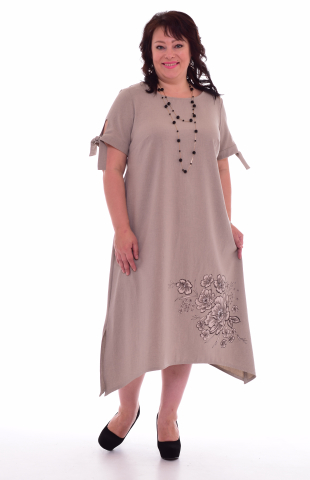 Женское платье из плотного мягкого вискозного трикотажа свободного кроя, присборено по талии, с поясом. Рукава длинные на манжете с завязками. Горловина круглая. Отрезная талия: нет. Длина платья по спинке: 42-100 см, 44-02 см, 46-104 см, 48-106 см, 50-107 см, 52-108 см, 54-109 см, 56-110 см. Длина рукава: 42-59 см, 44-60 см, 46-61 см, 48-61 см, 50-62 см, 52-62 см, 54-63 см, 56-63 см. Готовые изделия из джерси стирают только в режиме деликатной стирки с использованием мягких порошков, при 40 °C — это оптимальная температура практически для любого вида джерси. Отжим на невысоких оборотах. Сушат изделия из джерси в разложенном виде на сушилке или любой плоской поверхности.