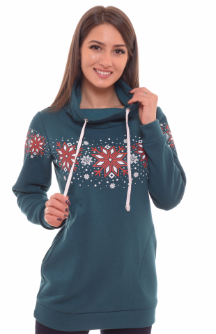 Женская туника из кулирки приталенного силуэта. Горловина полукруглая, окантованная. Рукав спущенный на манжете. Спина длиннее переда. Принт в виде печати придает изящность тунике. Длина изделия 50 размера: длина туники по спинке – 82 см. Состав 100%-хлопок.